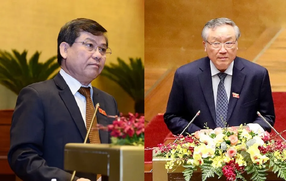 Viện trưởng VKSND Tối cao Lê Minh Trí (trái) và Chánh án TAND Tối cao Nguyễn Hòa Bình trình bày báo cáo công tác nhiệm kỳ 2016-2021 tại kỳ họp thứ 11, Quốc hội khóa XIV. Ảnh: QH-VGP