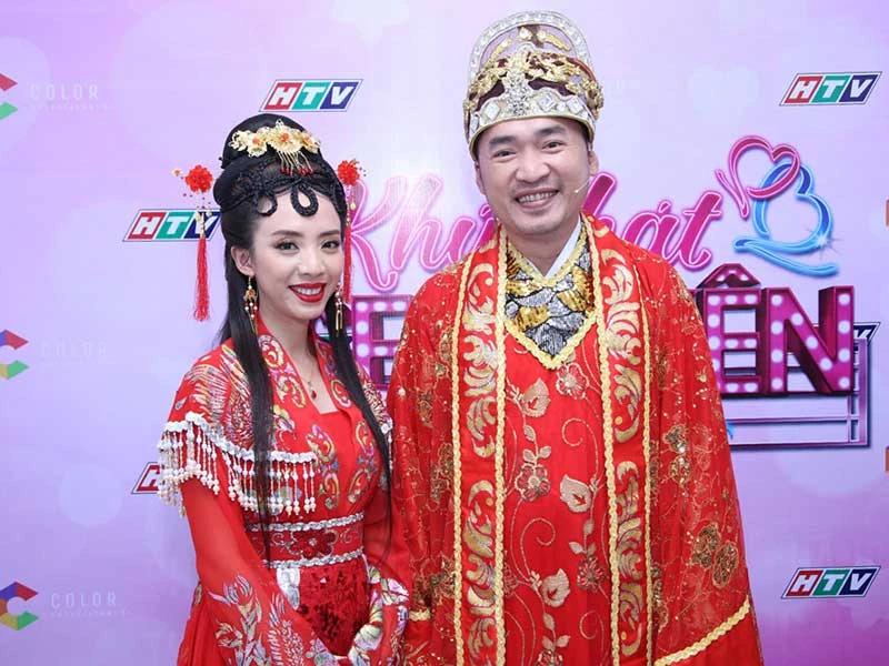 Cặp đôi diễn viên Tiến Luật - Thu Trang vào vai ông Tơ - bà Nguyệt trong chương trình Khúc hát se duyên. Ảnh: Nhà sản xuất cung cấp
