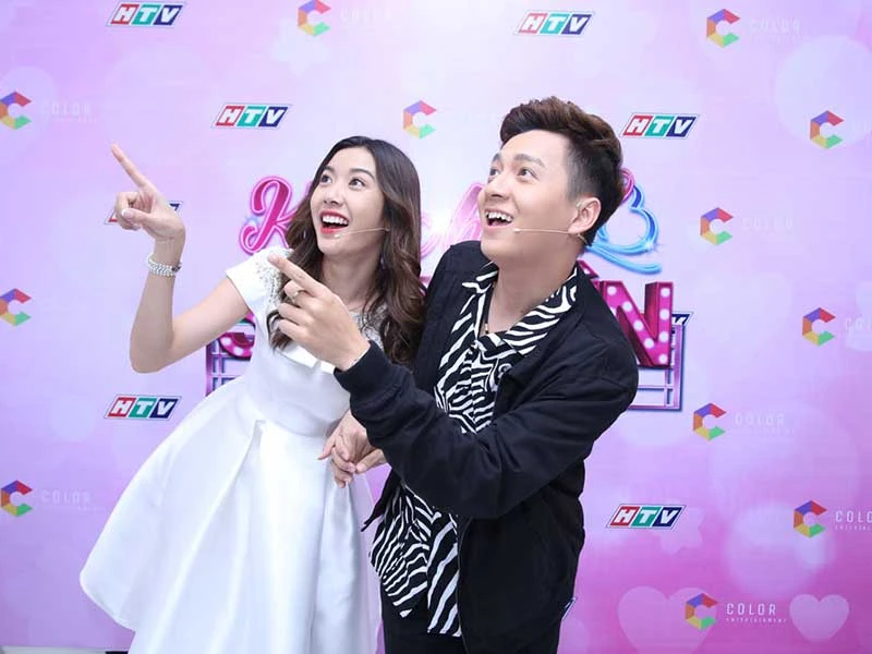 Ca sĩ Ngô Kiến Huy và á hậu Thúy Vân trong vai trò người dẫn dắt chương trình Khúc hát se duyên. Ảnh: Nhà sản xuất cung cấp