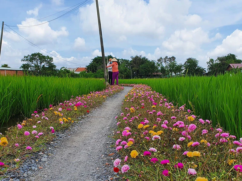 Con đường hoa đi xuyên qua cánh đồng của chị Hương tại xã Quy Đức thu hút nhiều người tới chụp ảnh. Ảnh: ĐẶNG LÊ