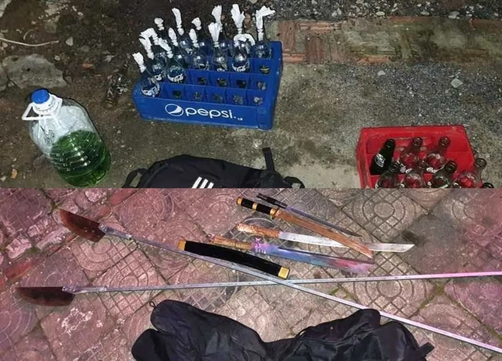 Tại hiện trường, cảnh sát phát hiện một két chai nước giải khát bằng thủy tinh đã được chế xăng và nhét giấy sẵn (bom xăng tự chế). Cạnh đó, một can nhựa chứa xăng và một két nước giải khát mà nhóm này chuẩn bị làm bom xăng.