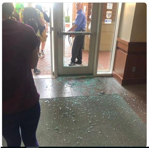 Một cửa sổ thư viện trường UNCC bị vỡ sau vụ nổ súng. Ảnh: CNN
