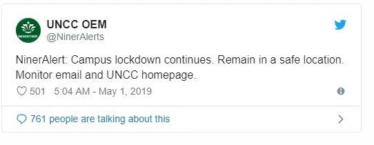 Twitter thông báo tình trạng khẩn cấp tại trường UNCC. Ảnh: CNN