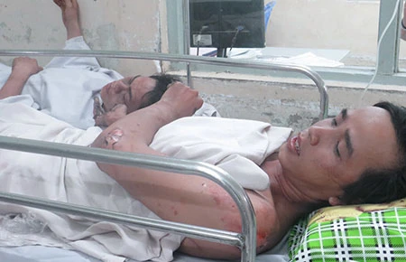 Theo BS Hiếu, các nạn nhân nhập viện trong tình trạng bỏng độ 1, 2, 3 kích thích co giật, tóc cháy xoăn, da toàn thân bị lột, mắt tổn thương. Các bác sĩ đã cấp cứu ban đầu và chuyển sáu công nhân lên BV Chợ Rẫy vì bỏng quá nặng.