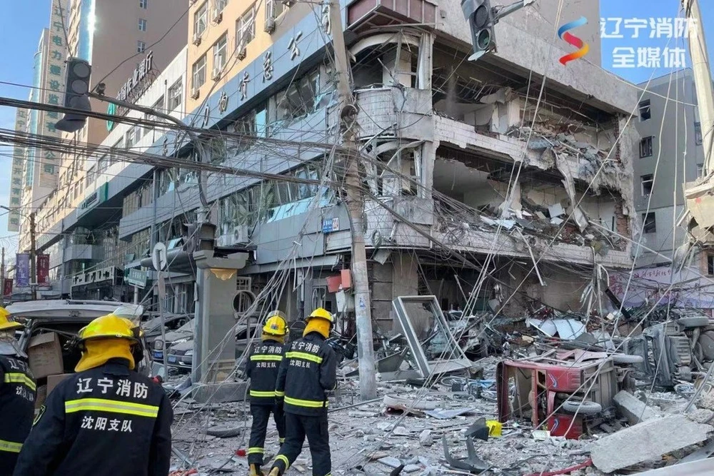 Hình ảnh từ Sở cứu hỏa tỉnh Liêu Ninh cho thấy phía mặt tiền của nhiều tòa nhà tại Thẩm Dương, thủ phủ tỉnh Liêu Ninh, hiện trong tình trạng ngổn ngang và xuất hiện nhiều đống đổ nát trên đường phố.
