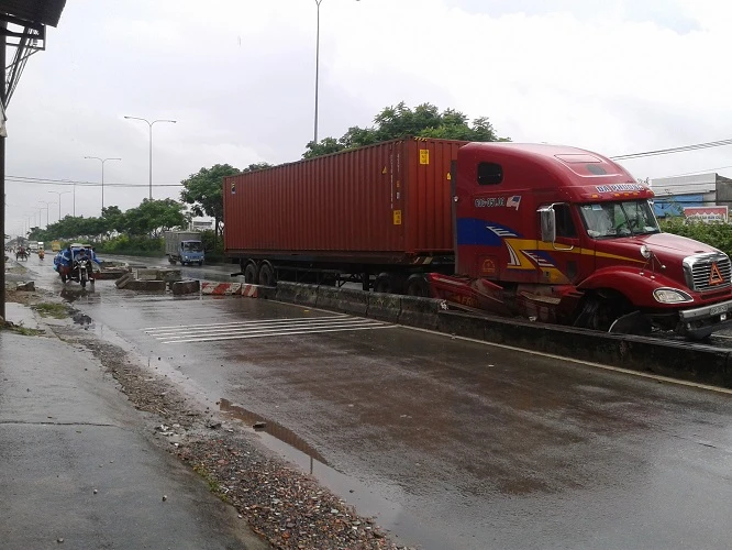 Lực tông quá mạnh khiến gần 20 khối bê tông văng ra, vỡ nát, ảnh hưởng lưu thông trên đường. Xe tải bị hư hỏng nặng phần đầu. Rất may, vụ việc không gây thiệt hại về người. Tài xế Nguyễn Quân, quê Quảng Nam cho biết đang chở mì lát đến cửa khẩu Mộc Bài, Tây Ninh thì xe nổ vỏ nên bị lạc tay lái.