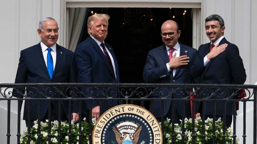 Tổng thống Mỹ Donald Trump (thứ hai từ trái sang) và các lãnh đạo, đại diện Israel, UAE, Bahrain tại lễ ký kết Hiệp ước Abraham tại Nhà Trắng hồi tháng 9. Ảnh: ABC NEWS