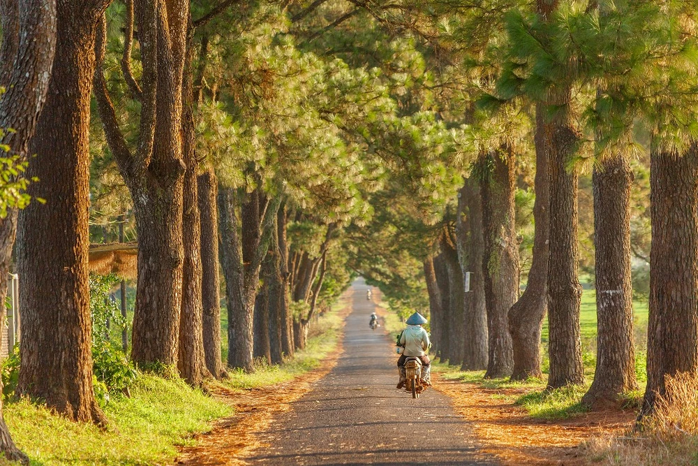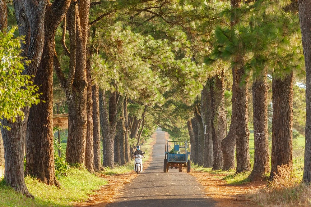 Dẫn vào đồi chè có một con đường nhỏ, hai bên đường hàng thông lá kim phủ kín.