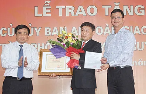Nhờ có biển báo “độc” làm giảm tai nạn, Ủy ban ATGT Quốc gia và lãnh đạo UBND tỉnh Nghệ An tặng bằng khen cho ông Nguyễn Tiến Định (giữa). Ảnh: Đ.LAM