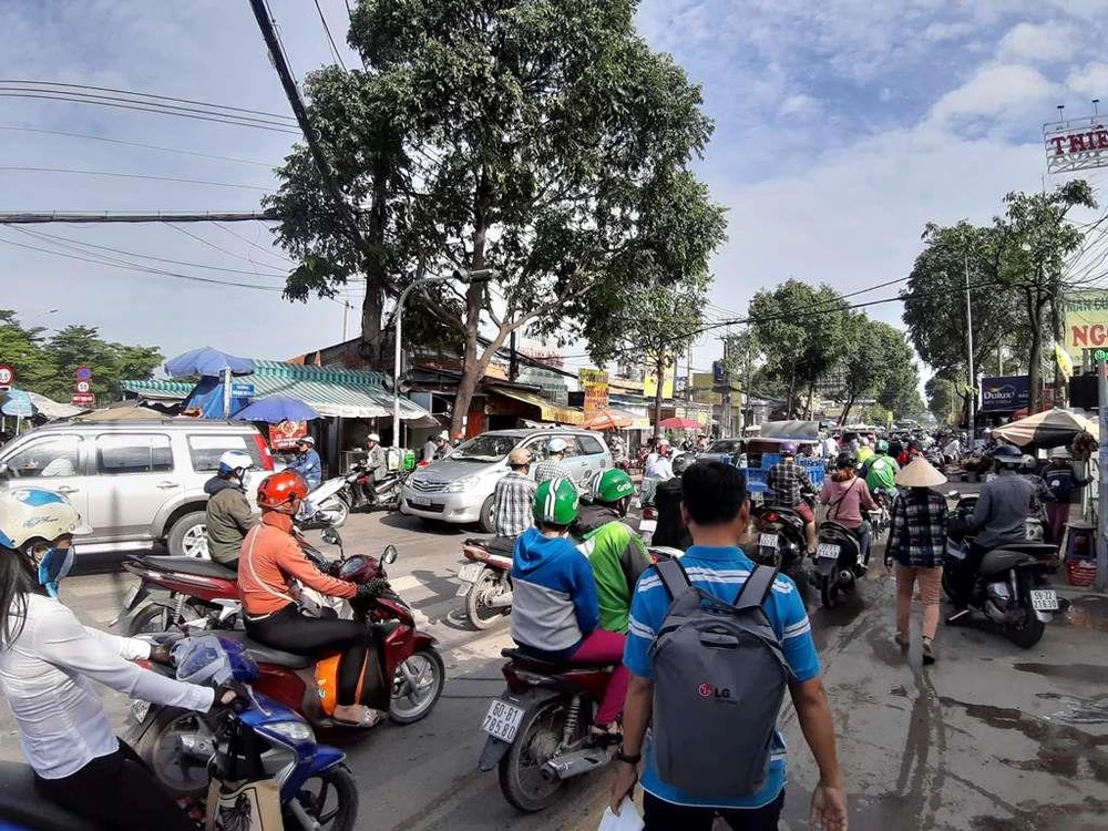 Hàng loạt phương tiện, người xếp hàng lên cầu Chánh Hưng. Ảnh: ĐÀO TRANG.