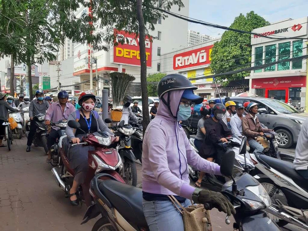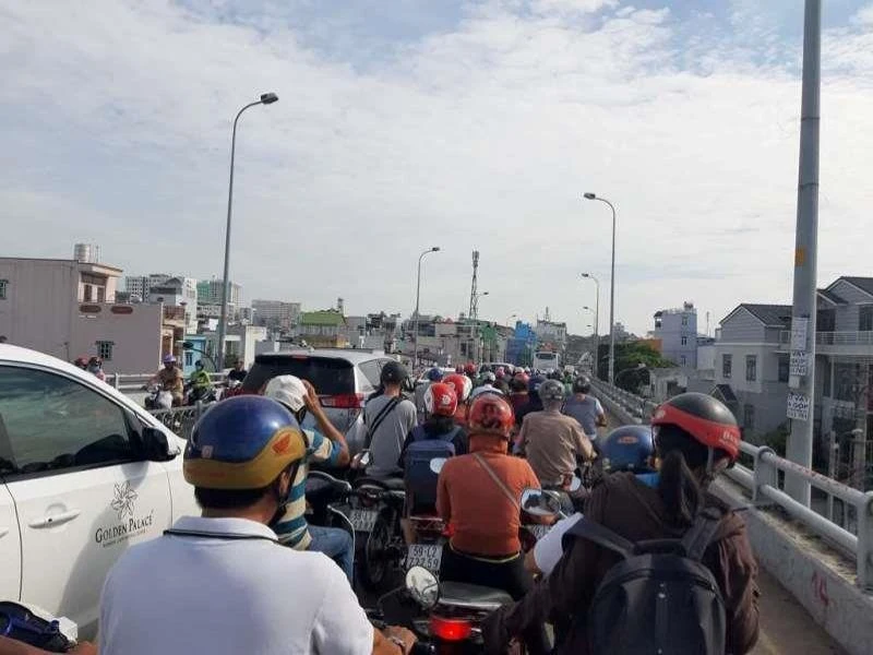 Chưa đi hết đoạn đường kẹt cứng, người dân phải xếp hàng dài để được lên cầu Chánh Hưng, từng xe máy nhúc nhích từng chút một.
