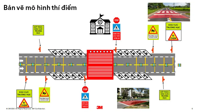 Mô hình thực hiện gồm lắp đặt bổ sung hệ thống biển báo trong phạm vi trường học như biển báo bắt đầu khu vực trường học, biển báo trẻ em qua đường, biển báo có người đi bộ qua đường và biển báo dừng.
