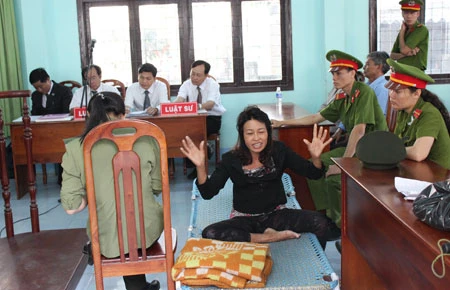 Bị cáo Nguyệt (ngồi trên giường xếp) trước công đường. Ảnh: HỒNG TÚ