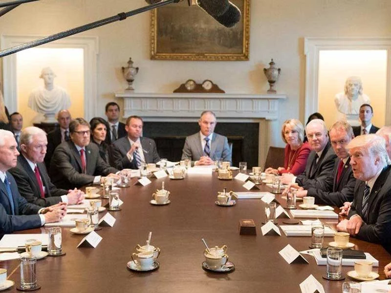 Nội các của Tổng thống Mỹ Donald Trump (thứ ba từ phải) năm 2019 sẽ thiếu vắng với sự ra đi của hàng loạt bộ trưởng. Ảnh: CBS NEWS
