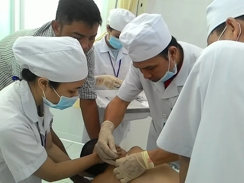 Các bác sĩ Viện Y Dược học dân tộc thăm khám cho một em bé bị bệnh tự kỷ. Ảnh: HM