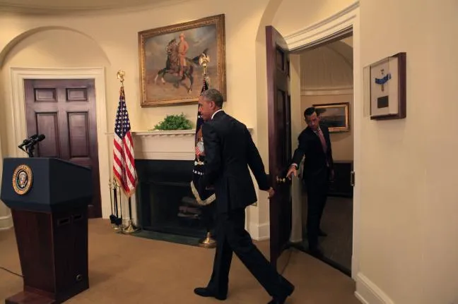 Tổng thống Obama bước vào phòng họp Roosevelt Room trong Nhà Trắng hồi tháng 6-2015. (Nguồn: UPI)