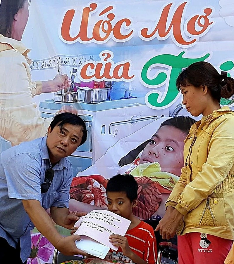 Đại diện báo Pháp Luật TP.HCM trao tặng số tiền 70 triệu đồng ủng hộ từ cộng đồng Facebook cho bé Triệu, nhân vật chính trong chương trình Ứơc mơ của Triệu ngày 11-2.