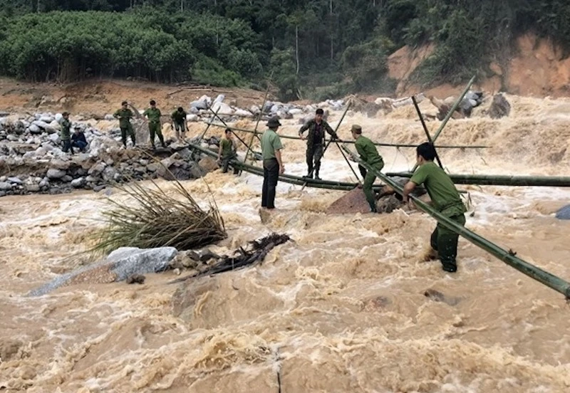 Công an làm cầu tạm qua suối tiếp cận hai xã bị cô lập Phước Thành và Phước Lộc. Ảnh: CAQN