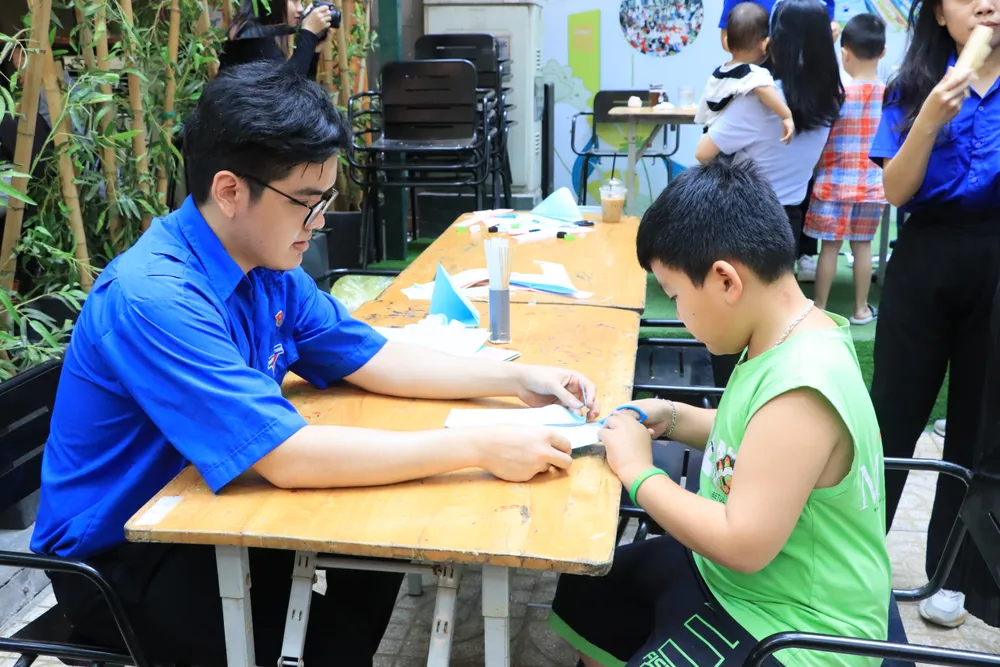 Các đoàn viên hướng dẫn cho trẻ làm xe phong lực và cho trẻ thử thành quả của mình. Ảnh: H.N |
