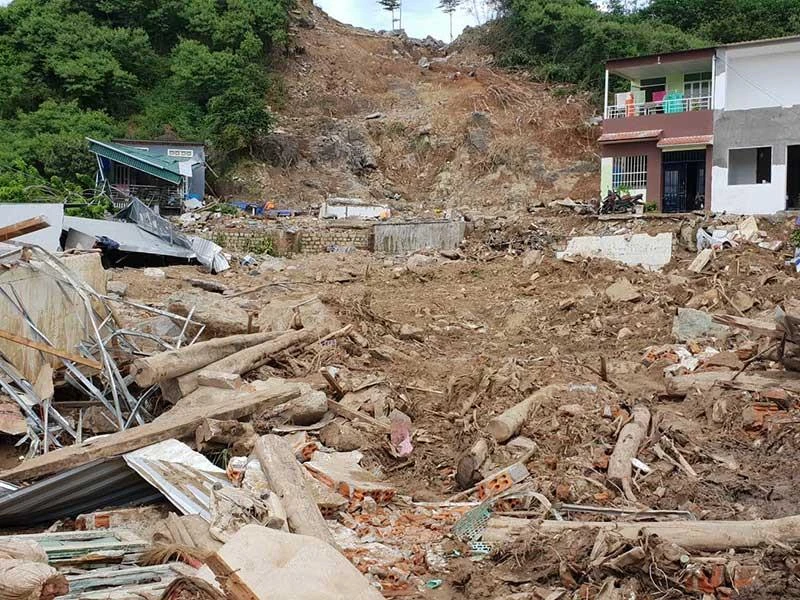 Nước từ dự án khu nhà ở cao cấp Hoàng Phú trên núi Cô Tiên bị vỡ, làm chết bốn người, sập 10 căn nhà. Ảnh: TẤN LỘC