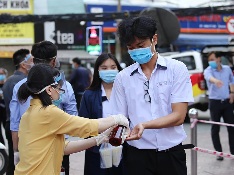 Học sinh khối 12 ở TP.HCM đeo khẩu trang và rửa tay sát khuẩn trước khi vào lớp. Ảnh: HOÀNG GIANG