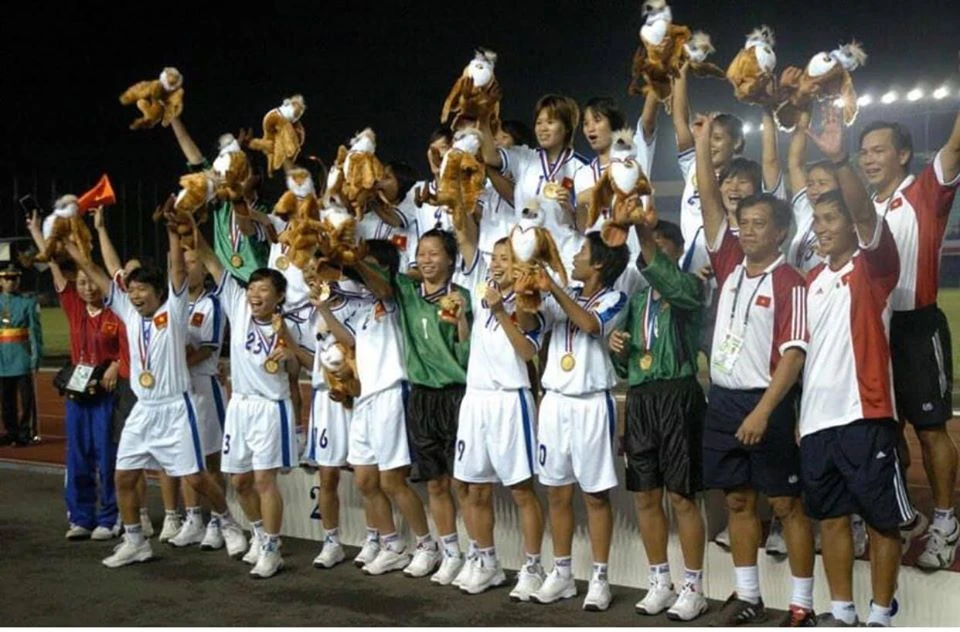 Tuyển nữ Việt Nam vô địch SEA Games 2005 với điểm nhấn là trận thắng Thái Lan ở vòng bảng và thắng Myanmar tại chung kết đều với tỉ số 1-0. Ảnh: TM