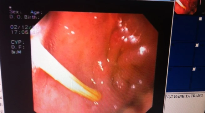 Theo lời bệnh nhân NHĐ (ngụ Cam Thuận, Cam Ranh), bệnh nhân cảm thấy đau âm ỉ vùng thượng vị. cơn đau ngày càng tăng nên sáng 27-10 bệnh nhân vào BV để khám. Qua siêu âm, nội soi dạ dày, các bác sĩ phát hiện một dị vật có đầu nhọn cắm sâu vào thành hành tá tràng.