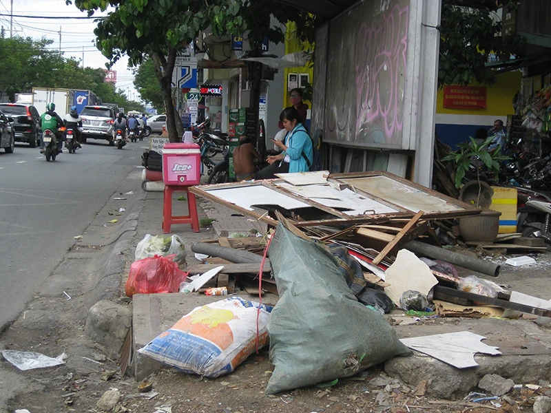 Nhà chờ xe buýt trên đường Nguyễn Tất Thành (phường 13, quận 4, TP.HCM) trở thành nơi tập kết rác của những người thiếu ý thức (ảnh).