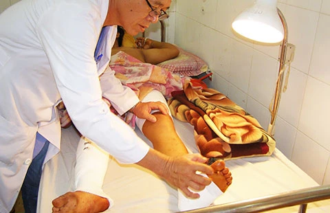 BS Phạm Văn Long đang kiểm tra bàn chân trái ông B. sau khi được nối. Ảnh: TRẦN NGỌC