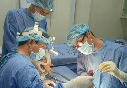 Các bác sĩ đang nối bàn tay đứt lìa của ông Dài. Ảnh: HOÀI AN