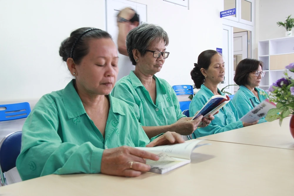 Chăm chú đọc cuốn Đừng ngồi chờ chết trong gió bão, chị Tạ Thị Ngát (46 tuổi, quê Thanh Hóa) chia sẻ rất phấn khởi khi thấy người bệnh có khu sinh hoạt riêng. Trong thời gian điều trị tại bệnh viện, chị sẽ tranh thủ tìm đọc những cuốn sách ở khu vực này.