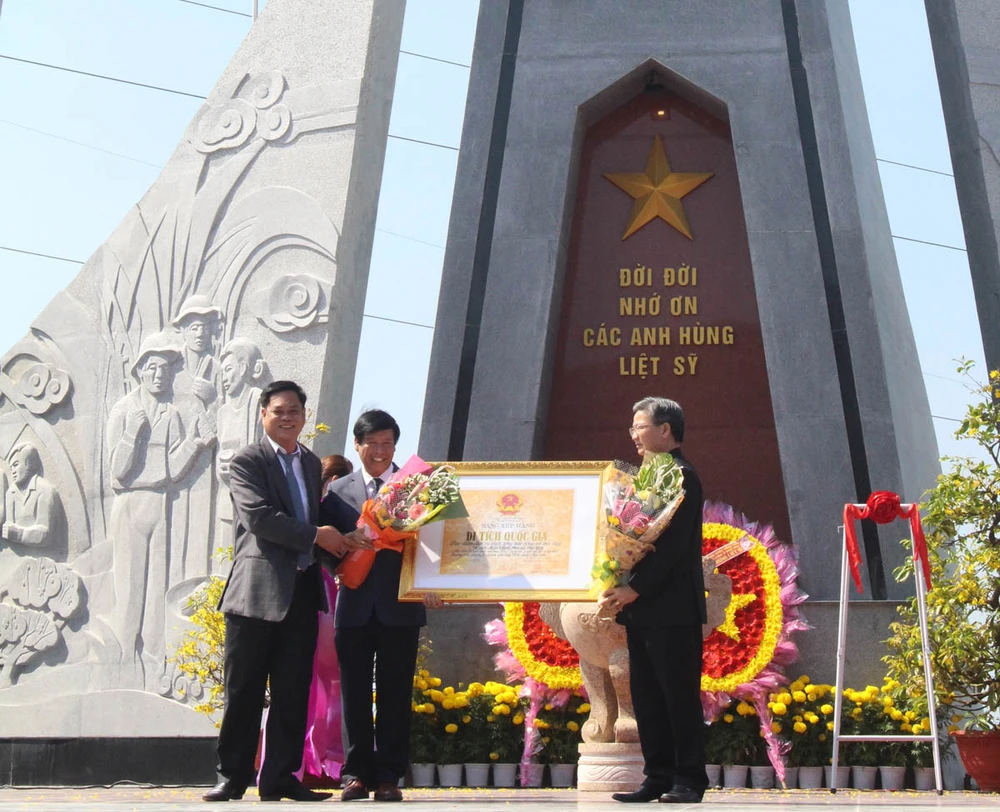 Ông Huỳnh Tấn Việt, Bí thư Tỉnh ủy Phú Yên (bìa trái) trao bằng công nhận di tích lịch sử quốc gia cho lãnh đạo Sở VH-TT&DL, UBND TP Tuy Hòa. Ảnh: TẤN LỘC
