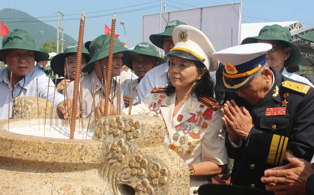 Các cựu chiến binh dâng hương tưởng niệm các anh hùng, liệt sĩ tại đài tưởng niệm. Ảnh: TẤN LỘC