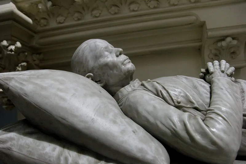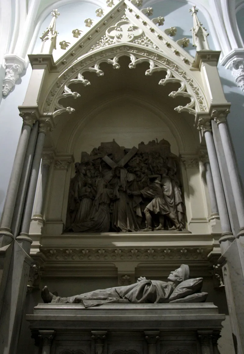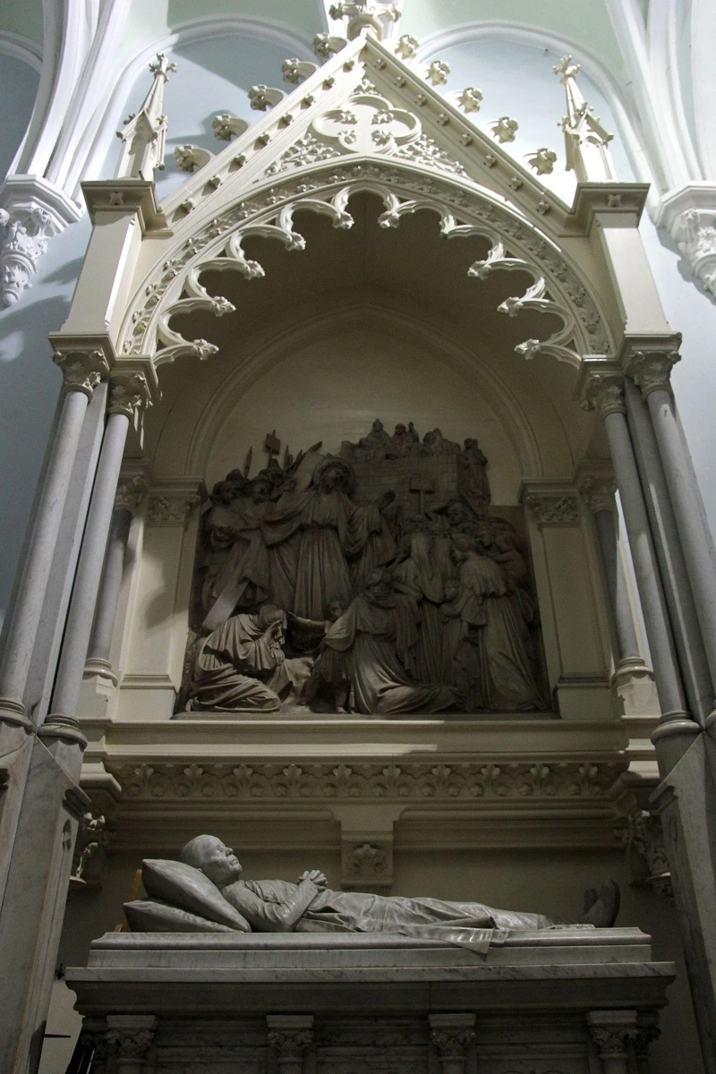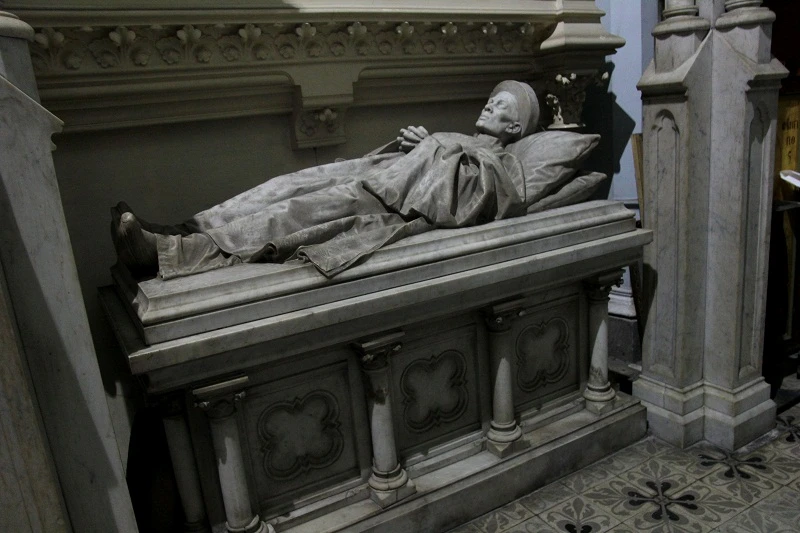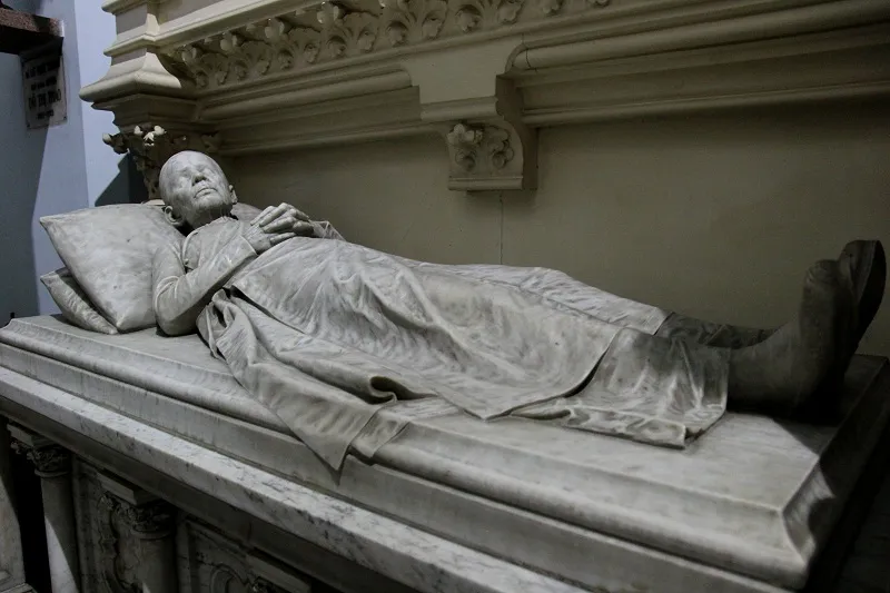 Năm 1920, sau khi vợ ông là bà Huỳnh Thị Tài mất, người ta mới đưa hai ông bà chôn ở gian trái sau cung thánh của nhà thờ này. Giữa hai phần mộ là đài thờ mang cụm tượng thể hiện phút lâm chung của Chúa Jesus.