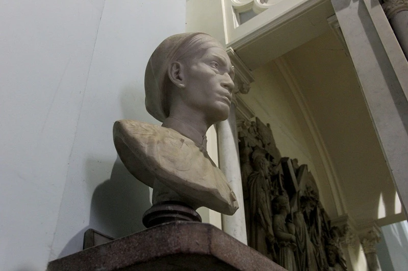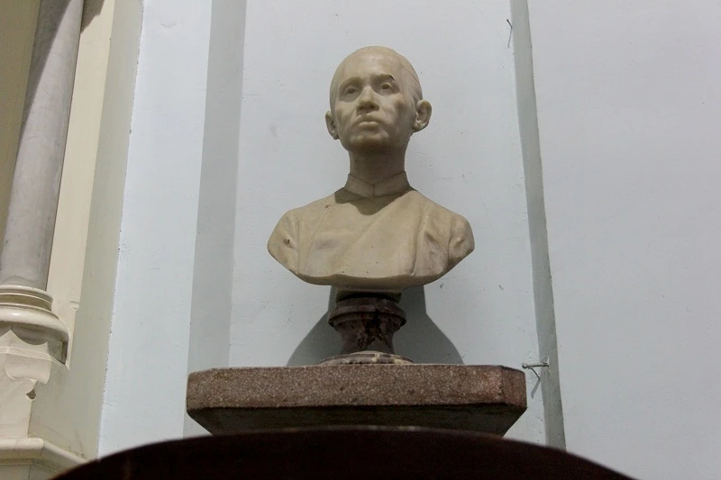Ông Huyện Sỹ tên thật là Lê Nhứt Sỹ (1841-1900), sinh tại Cầu Kho (Sài Gòn) nhưng gốc ở Tân An (Long An) trong một gia đình theo đạo Công giáo. Ngay lúc nhỏ, ông được các tu sĩ người Pháp đưa đi du học ở Malaysia. Tại đây, ông Huyện Sỹ được học ngôn ngữ Latinh Pháp, Hán và chữ Quốc ngữ. Trong ảnh: Bức tượng bán thân và tấm bia ghi tên thật của ông là Lê Phát Đạt cùng năm sinh, năm mất.