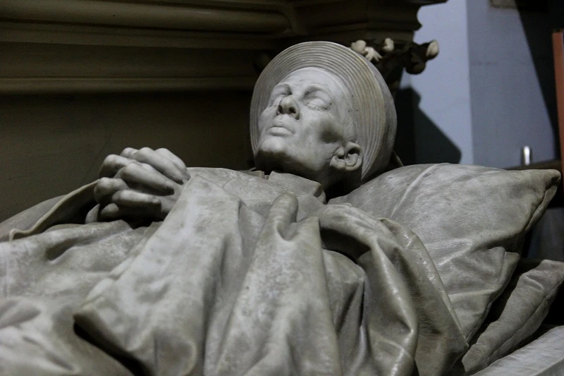 Tượng bà Huỳnh Thị Tài để đầu trần, cũng gối trên hai chiếc gối, mắt nhắm kín, mặc áo dài gấm, hai bàn tay đan vào nhau trước ngực, chân đi vớ và mang hài thêu.