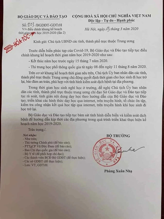 Trước đó, ngày 22-2, Bộ GD&ĐT đã ký công văn gửi chủ tịch UBND các tỉnh, thành phố trực thuộc trung ương về việc điều chỉnh khung kế hoạch thời gian năm học 2019-2020.