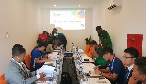Ban tổ chức đã phổ biến các quy định trong điều lệ của môn bóng đá nam Asiad 18 và tiến hành các thủ tục kiểm tra danh sách đăng ký thi đấu của các đội. Theo đó tại vòng bảng, các đội sẽ thi đấu theo thể thức vòng tròn một lượt tính điểm xếp hạng.