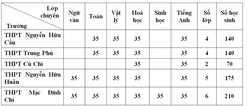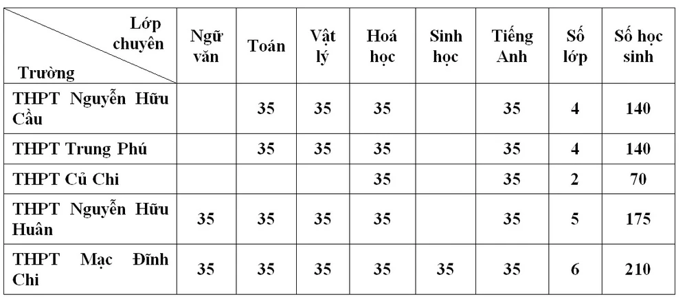 Cụ thể, chỉ tiêu HS trường chuyên và lớp chuyên là 2.230 em của 9 trường gồm THPT chuyên Lê Hồng Phong, chuyên Trần Đại Nghĩa, chuyên Trường THPT Nguyễn Thượng Hiền,THPT Gia Định, Nguyễn Hữu Cầu,Trung Phú, Củ Chi, Nguyễn Hữu Huân, Mạc Đĩnh Chi . Trong đó, trường THPT Chuyên Lê Hồng Phong tuyển 180 HS lớp 10 không chuyên và THPT Chuyên Trần Đại Nghĩa cũng tuyển 90 em khối không chuyên.