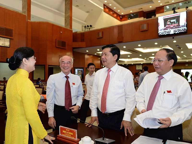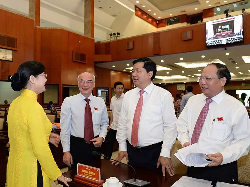 Các lãnh đạo TP.HCM trao đổi về những thành tựu đạt được cũng như những điều chưa được phát huy đúng mức của TP.HCM tại kỳ họp. Ảnh: TÁ LÂM
