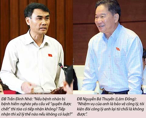 Phó Chủ nhiệm Ủy ban Quốc phòng - An ninh Trần Đình Nhã (Bà Rịa-Vũng Tàu) cũng cho rằng đề xuất của ban soạn thảo chưa đủ sức thuyết phục, chưa căn cứ vào thực tiễn. “Thời gian qua, bao nhiêu việc tòa phải từ chối vì không có luật?” - ông Nhã đặt câu hỏi và cho rằng cơ quan soạn thảo đã không lường hết những phức tạp có thể phát sinh trong thực tiễn khi nguyên tắc này bị lợi dụng để yêu cầu giải quyết các vấn đề về quyền con người, yêu cầu của các tổ chức tôn giáo... “Nếu bệnh nhân bị bệnh hiểm nghèo yêu cầu về “quyền được chết” thì tòa có tiếp nhận không? Tiếp nhận thì xử lý thế nào nếu không có luật?” - ông Nhã thắc mắc.