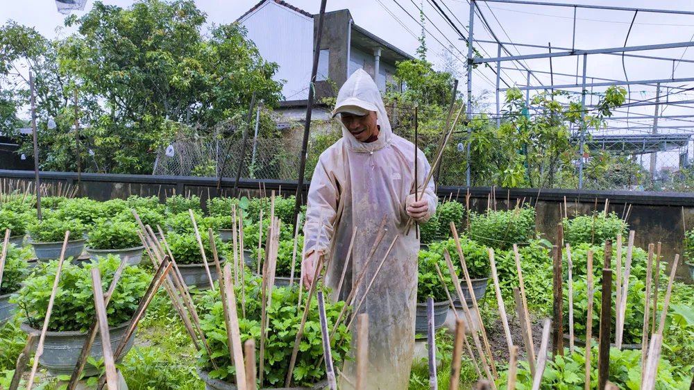 Người dân buộc những thanh tre xung quanh giúp chậu cúc có dáng đẹp. Ảnh: NGUYỄN DO