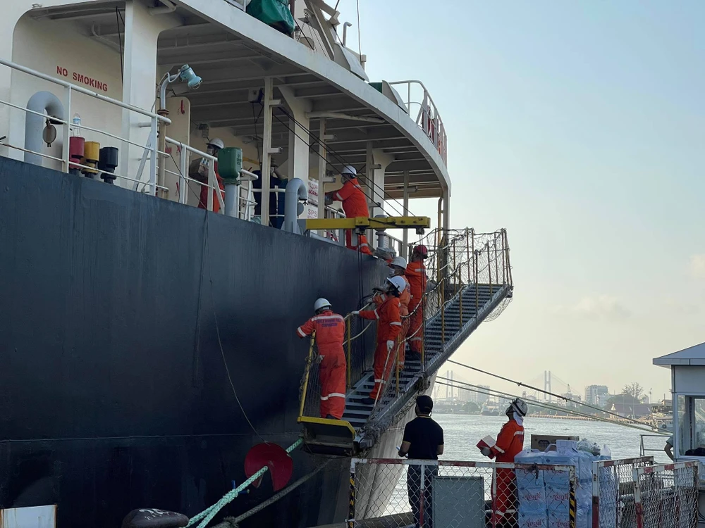 Cụ thể, hơn 6 giờ sáng ngày 10-5, những hình ảnh đầu tiên về tàu Kaisa chở đoàn tàu số 2 và số 3 của tuyến metro số 1 đã chính thức cập cảng Khánh Hội (quận 4). Các thuyền viên, nhân viên cảng đang làm thủ tục cập cảng, neo đậu tàu.
