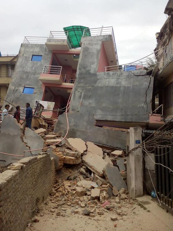 Tòa tháp lịch sửDharahara (Bhimsen), có niên đại từ năm1832, cũng bị sụp đổ tạiKathmandu, Di tích cao 62 mét này là một phần của kiến trúc Kathmandu được Tổ chức UNESCO công nhận là di sản.