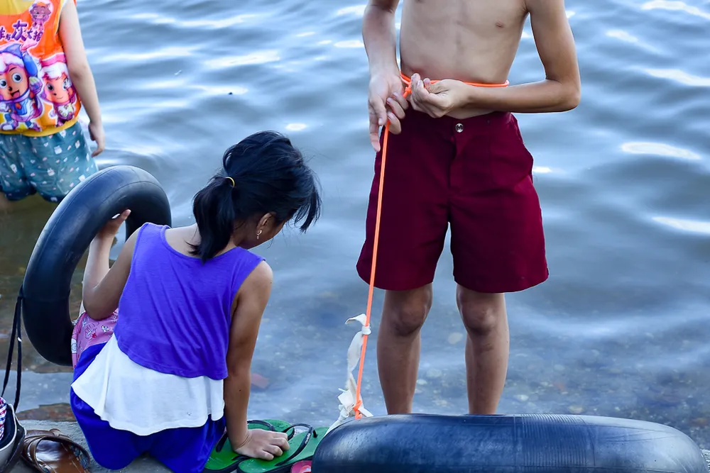 Sông Hương có dòng nước sâu, nên những người lớn trẻ nhỏ đa phần đều sử dụng áo phao, phao cứu hộ để đảm bảo an toàn. Hình ảnh một em nhỏ cẩn thận buộc chặt sợ dây liên kết với phao vào người mình. N.DO