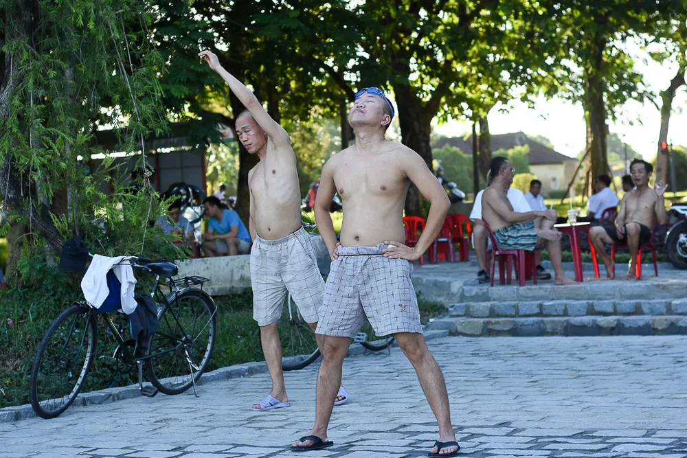 Dọc bờ sông nhiều người đến khởi động, tập những bài thể dục nhẹ để chuẩn bị xuống tắm giữa dòng sông Hương. Ảnh: N.DO