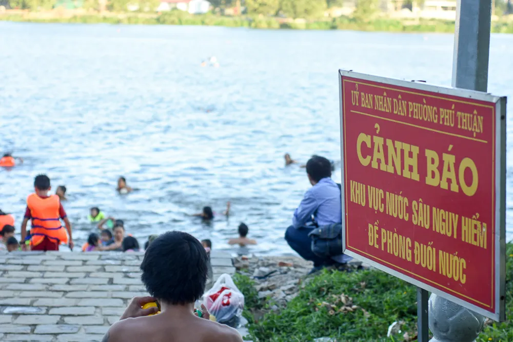 Ngay trên bờ, UBND phường Phú Thuận (TP Huế) đã đặt biển cảnh báo nguy hiểm vì dòng nước sâu. Ảnh: N.DO