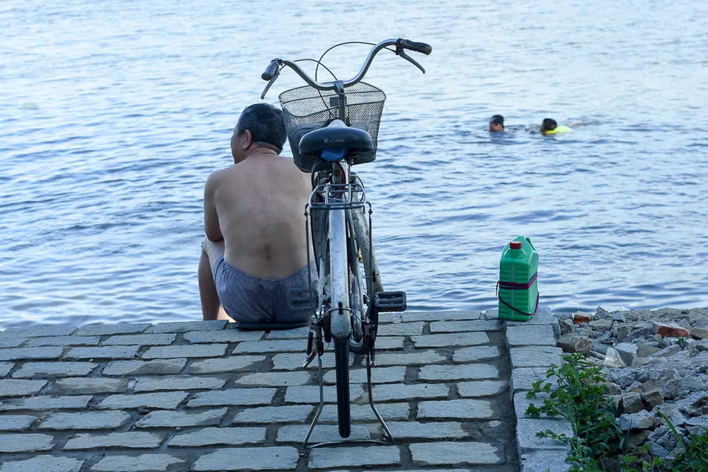 Ngay từ 3 giờ chiều, nhiều người dân đã đến hai bên bờ sông Hương để ngồi hóng gió. Dưới sông nhiều người cũng bắt đầu dầm mình dưới dòng nước xanh mát. Ảnh: N.DO