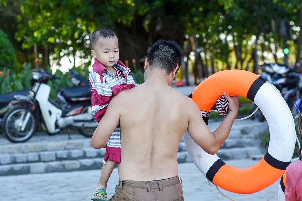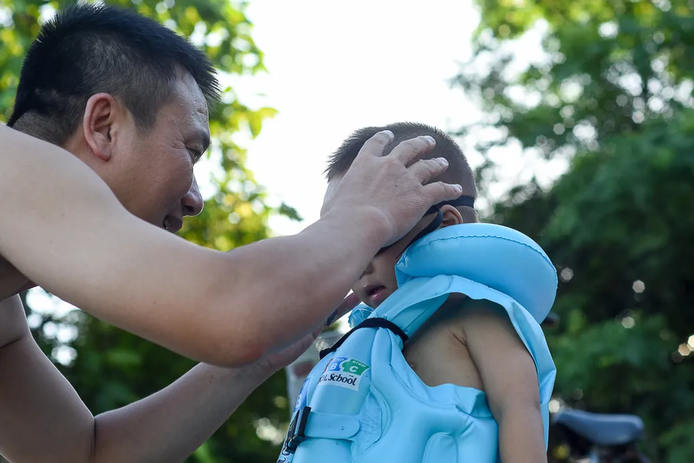 Ông bố đang mặc áo phao, mắt kính cho con trai 2 tuổi trước khi cùng xuống tắm. Ảnh: N.DO