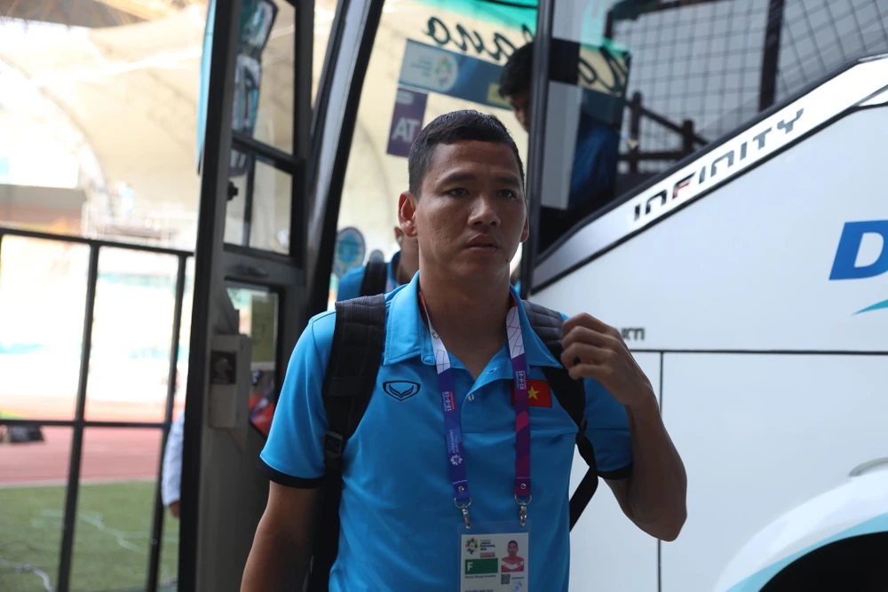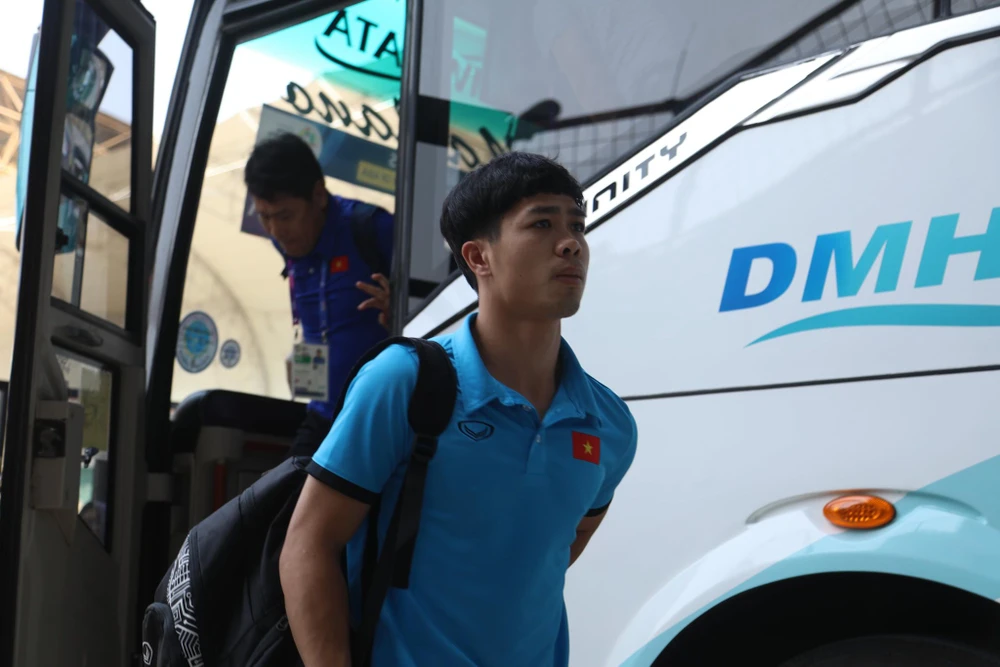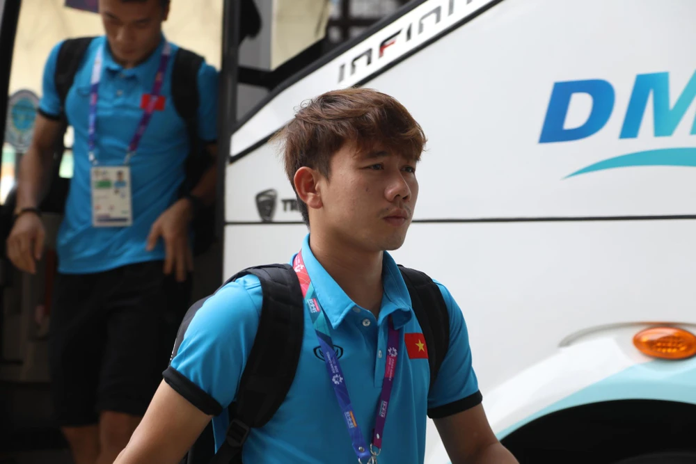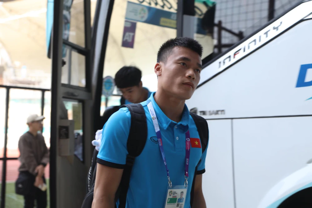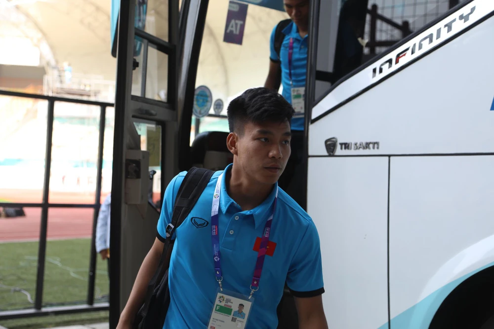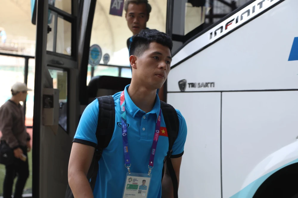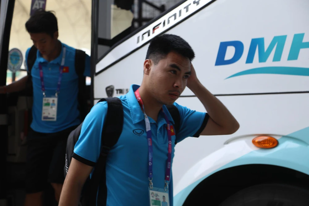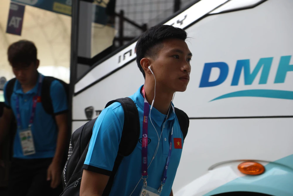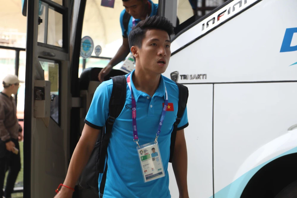 Văn Hậu bước xuống chiếc xe chở đội tuyển Olympic Việt Nam.